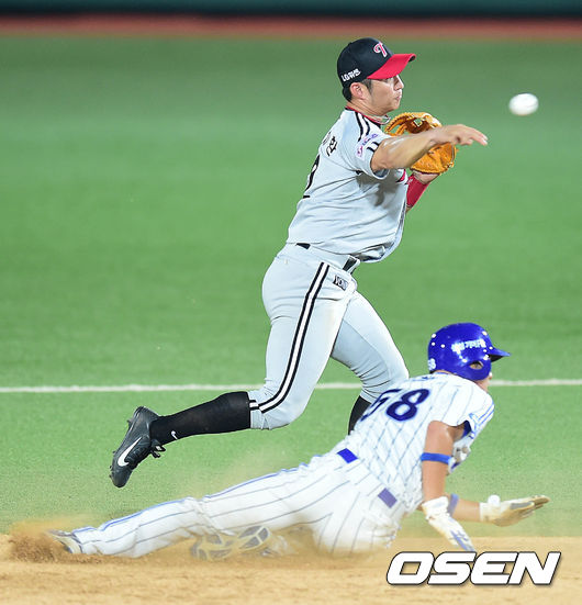 4회말 삼성 공격 1사 1루 상황 채태인의 병살타 때 LG 유격수 오지환이 주자 박해민을 포스아웃 시킨 뒤 1루로 송구하고 있다.