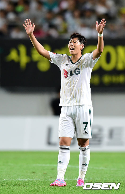 30일 오후 서울월드컵경기장에서 열린 'LG전자 초청 바이엘 04 레버쿠젠 한국투어 2014' FC서울과 레버쿠젠의 경기, 후반 레버쿠젠 손흥민이 동료선수에 빨리 시작하라며 소리치고 있다.