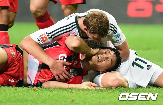 30일 오후 서울월드컵경기장에서 열린 FC 서울과 바이엘 04 레버쿠젠의 경기 후반 이웅희와 슈테판 키슬링이 넘어지자 서로를 격려하고 있다.