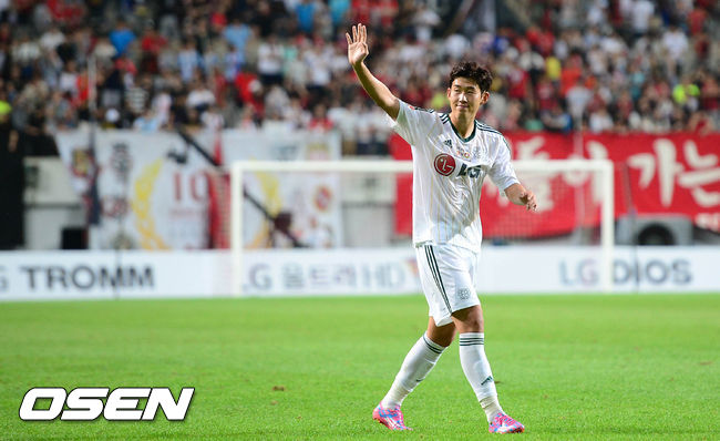 30일 오후 서울월드컵경기장에서 열린 FC 서울과 바이엘 04 레버쿠젠의 경기 종료 후 손흥민이 팬들을 향해 손을 흔들고 있다.