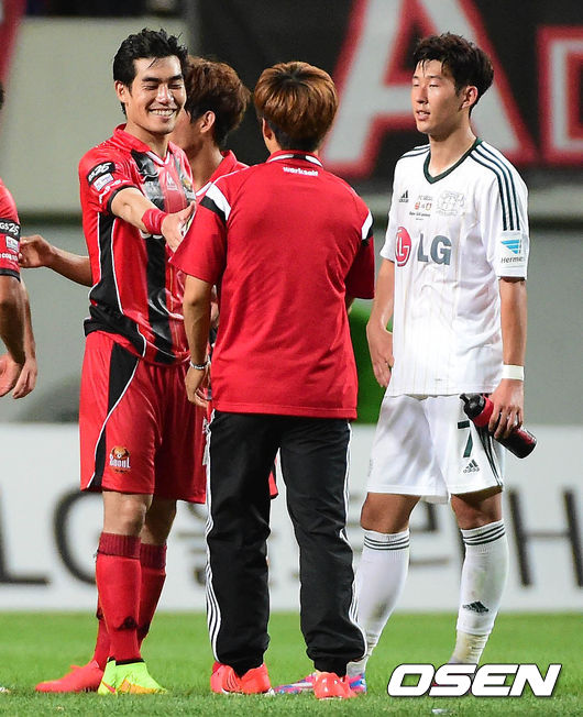 30일 오후 서울월드컵경기장에서 열린 FC 서울과 바이엘 04 레버쿠젠의 경기 종료 후 김주영과 류승우가 인사를 나누고 있다.