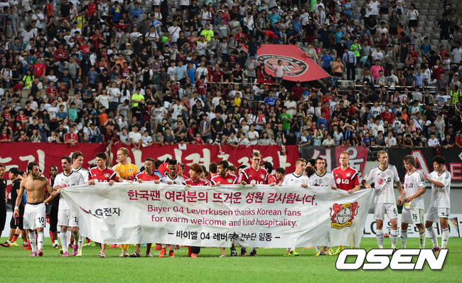 30일 오후 서울월드컵경기장에서 열린 FC 서울과 바이엘 04 레버쿠젠의 경기 종료 후 레버쿠젠 선수들이 관중들에게 인사를 하고 있다.