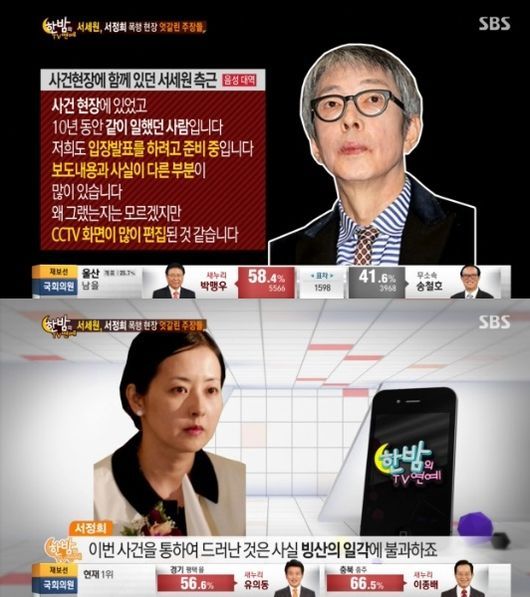 반면 서정희는 "심리적으로 많이 힘들고, 충격 받았다"며 "이번 사건 통해 드러난 것은 빙산의 일각에 불과하다. 방송에서는 차마 말할 수 없는 일이 수없이 많다. 여자문제도 있었고 그 문제로 발단이 된 건 사실이다"라고 밝혔다.