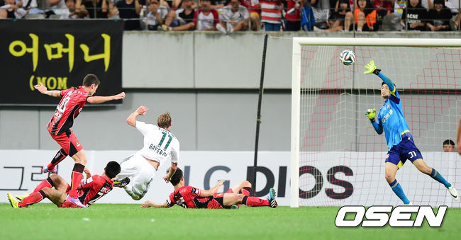 30일 오후 서울월드컵경기장에서 열린 FC 서울과 바이엘 04 레버쿠젠의 경기, 후반 레버쿠젠 키슬링의 슛을 서울 유상훈이 막아내고 있다.