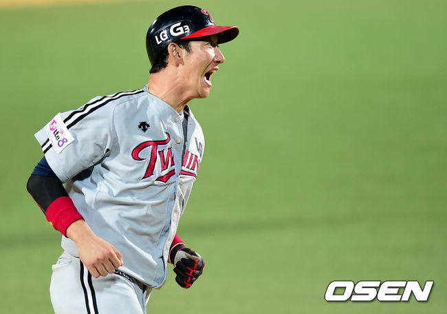 9회초 LG 공격 2사 2루 상황 손주인이 삼성 임창용을 상대로 역전 좌월 투런포를 날리고 그라운드를 돌며 포효하고 있다.
