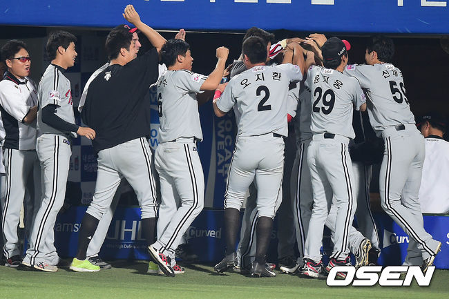 9회초 LG 공격 2사 2루 상황 손주인이 삼성 임창용을 상대로 역전 좌월 투런포를 날리고 홈을 밟은 뒤 더그아웃 동료들과 인사를 나누며 기뻐하고 있다.