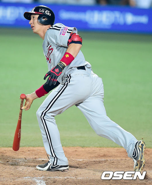 9회초 LG 공격 2사 2루 상황 손주인이 삼성 임창용을 상대로 역전 좌월 투런포를 날리고 타구를 바라보고 있다.