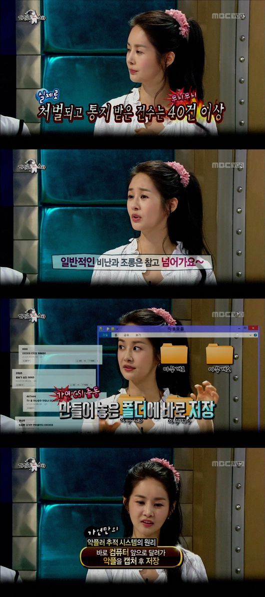 이어 “나는 계속 조사를 한다. 한 번 찍히면 그 사람을 계속 조사하고, 악성댓글을 올리면 지우기 전에 스크린 샷으로 캡처해서 그 사람 폴더에 저장한다”고 설명했다.