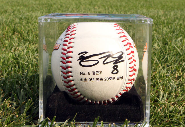 이번 기념 상품은 “No.8 정근우 최초 9년 연속 20도루 달성”이라는 문구가 새겨진 기념구에 정근우 선수가 직접 사인을 하고 이것을 고급 케이스에 담았으며 정근우 선수의 역대 도루 숫자 만큼인 285 세트 한정으로 제작 판매된다.
