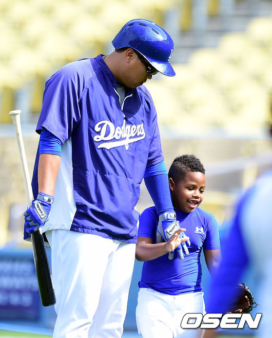 다저스 다저스 류현진이 라미레즈 아들에게 장난을 치고 있다.
