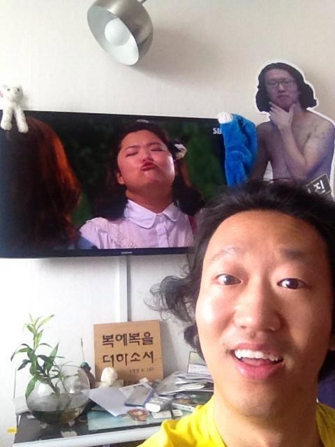 사진 속 김경진은 TV를 배경으로 카메라를 바라보고 있다. TV에는 '청담동 스캔들' 속 양해림의 모습이 담겨 있어 눈길을 끈다.