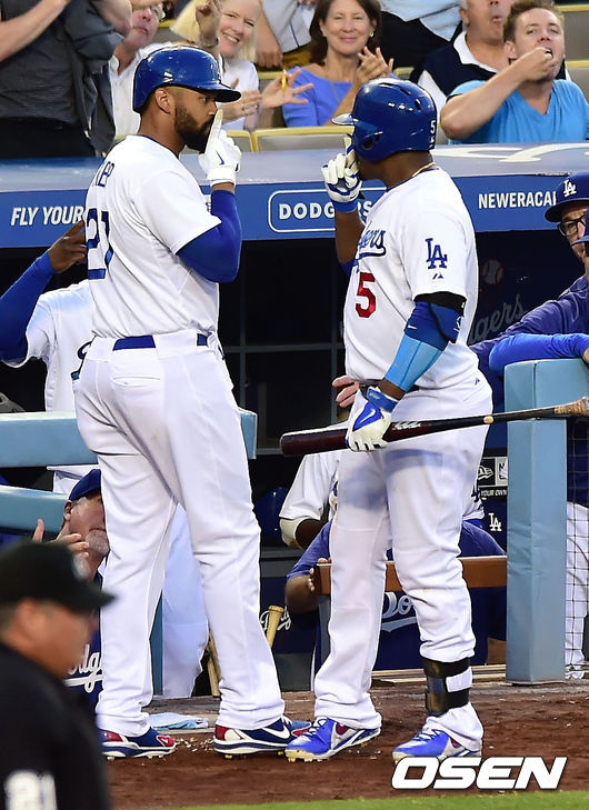 2회말 무사 다저스 켐프가 솔로 홈런을 때린 뒤 유리베와 세레머니를 하고 있다.