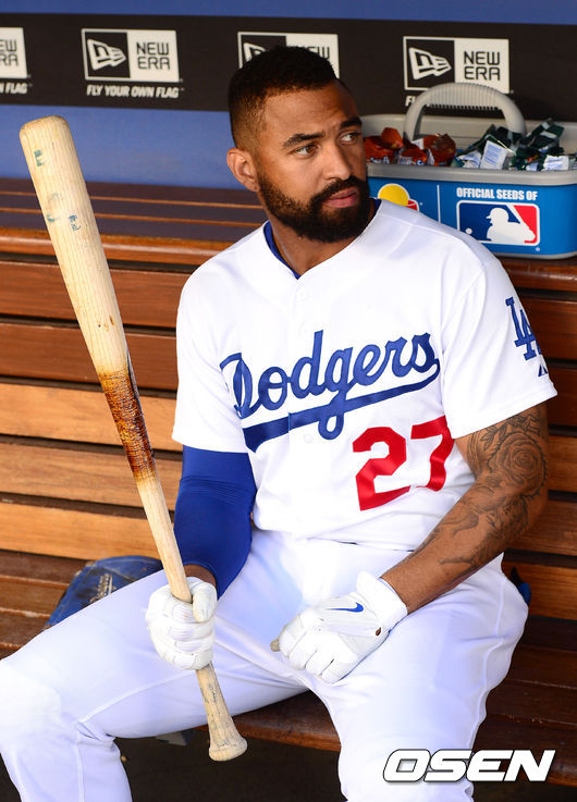 경기에 앞서 다저스 켐프가 더그아웃에 앉아 휴식을 취하고 있다.