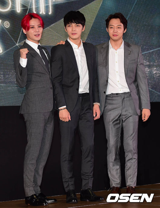 31일 오후 서울 삼성동 코엑스에서 열린 JYJ 멤버십위크 개막 세리머니에서 준수, 재중, 유천이 포토타임을 갖고 있다.