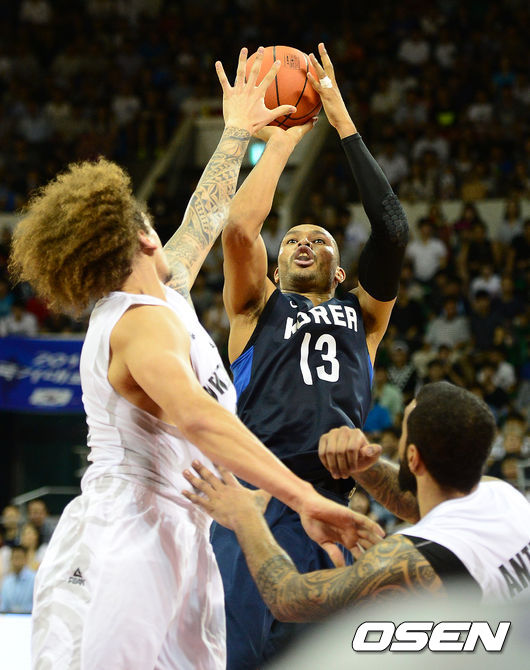 2쿼터 한국 문태종이 뉴질랜드 수비를 피해 슛을 시도하고 있다.