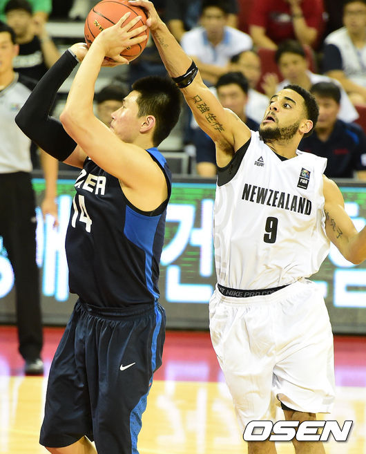 3쿼터 뉴질랜드 웹스터가 한국 오세근에 슛블록을 하며 파울을 하고 있다.