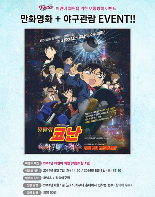 LG트윈스가 여름방학을 맞이해 2014년 어린이 회원 가족을 대상으로 만화영화와 야구를 한꺼번에 즐길 수 있는 무료 이벤트를 진행한다.