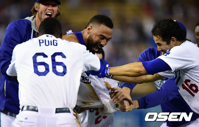 끝내기 안타를 때린 맷 켐프가 동료들에게 축하받고 있다./youngrae@osen.co.kr