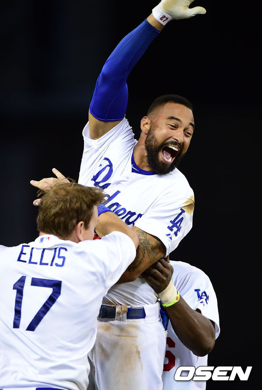 끝내기 안타를 때린 맷 켐프가 동료들과 기뻐하고 있다./youngrae@osen.co.kr