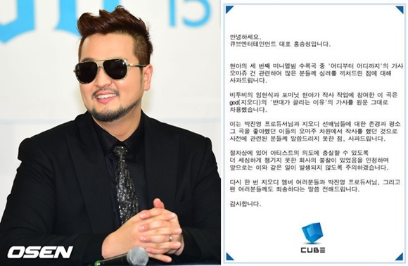 현아와 임현식이 소속된 큐브엔터테인먼트 홍승성 대표도 직접 사과에 나섰다. 홍 대표는 이날 오후 소속사 공식 트위터에 "현아의 '어디부터 어디까지'의 가사 오마주건 관련해 많은 분들께 심려를 끼쳐드린 점에 대해 사과드린다"며 "임현식과 현아가 작사 작업에 참여한 이 곡은 god의 '반대가 끌리는 이유'의 가사를 원문 그대로 차용했습니다"라고 설명했다.