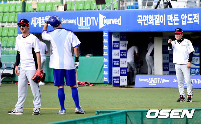 31일 오후 대구구장에서 열리는 '2014 한국야쿠르트 세븐 프로야구' 삼성 라이온즈와 LG 트윈스의 경기를 앞두고 LG 양상문 감독이 삼성 채태인, LG 손주인과 인사를 나누고 있다.