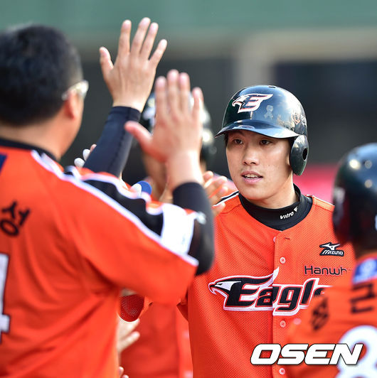 2회초 1사 1,2루에서 한화 정범모가 좌월 스리런 홈런을 치고 더그아웃에서 동료들과 환호하고 있다.