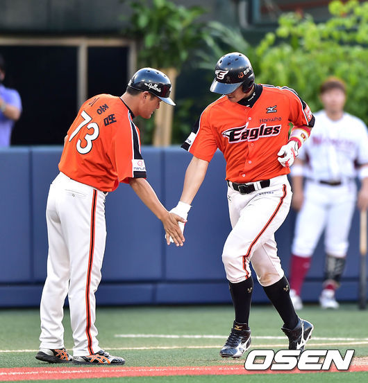 2회초 1사 1,2루에서 한화 정범모가 좌월 스리런 홈런을 치고 이종범 코치와 하이파이브를 하고 있다.
