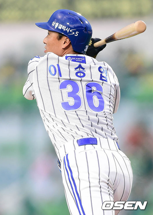 1회말 삼성 공격 1사 만루 상황 이승엽이 선제 1타점 좌익수 희생플라이를 날리고 있다.