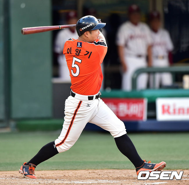 2회초 1사 1,2루에서 한화 이양기가 좌전 적시타를 치고 있다.