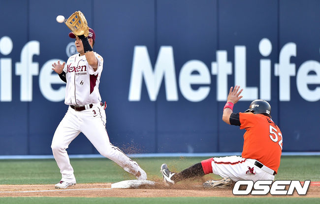 3회초 1사 2루에서 한화 피에 타석때 2루주자 김태균이 넥센 하영민의 폭투를 틈타 도루에 성공하고 있다.