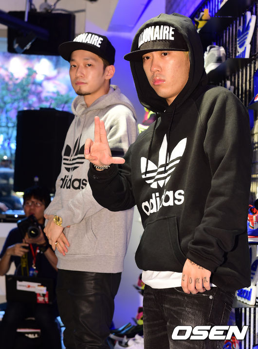 31일 오후 서울 압구정동 '아디다스 오리지널스 서울 플래그쉽 스토어'에서 열린 오픈 기념행사에 참석한 가수 일리네어 크루 도끼, 더 콰이엇이 포즈를 취하고 있다.