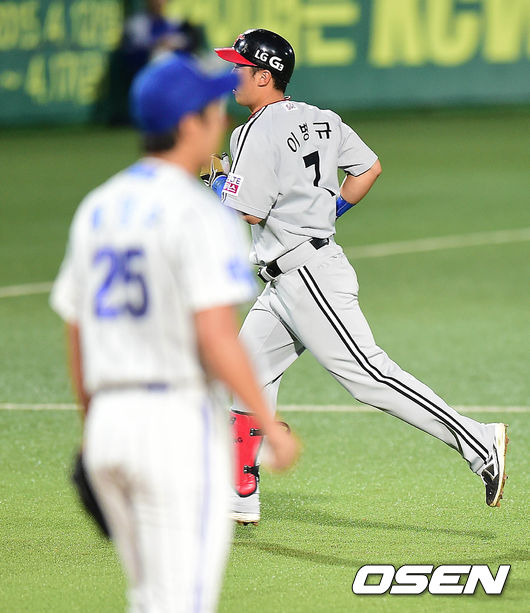 4회초 LG 공격 1사 주자없는 상황 이병규가 추격의 우월 솔로포를 날리고 그라운드를 돌고 있다.