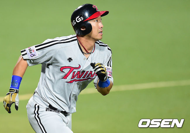 4회초 LG 공격 1사 주자없는 상황 이병규가 추격의 우월 솔로포를 날리고 타구를 바라보며 1루를 향해 뛰고 있다.
