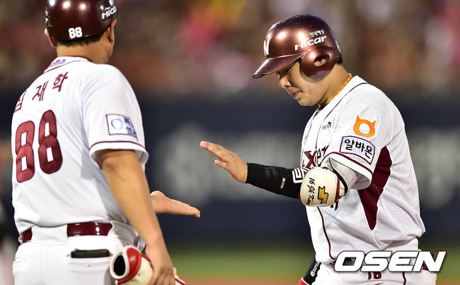 4회말 1사 2루에서 넥센 강정호가 중전 적시타를 치고 심재학 코치와 하이파이브를 하고 있다.