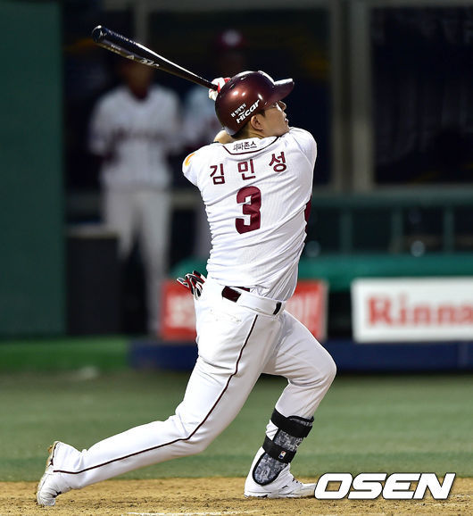 김민성은 31일 목동구장에서 열린 ‘2014 한국야쿠르트 세븐 프로야구’ 한화 이글스전에 6번 타자 겸 3루수로 선발 출전했다. 김민성은 팀이 1-4로 뒤진 4회말 1사 1루 풀카운트에서 앨버스의 높은 140km의 직구를 받아쳐 좌중간 담장을 넘기는 투런포를 쏘아 올렸다. 비거리 125m의 홈런이자 김민성의 9호 홈런이었다.