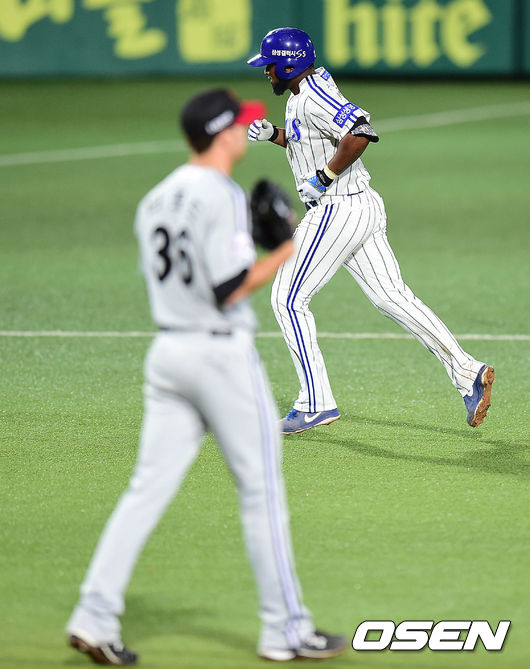 4회말 삼성 공격 1사 2루 상황 나바로가 좌월 투런포를 날리고 그라운드를 돌고 있다.