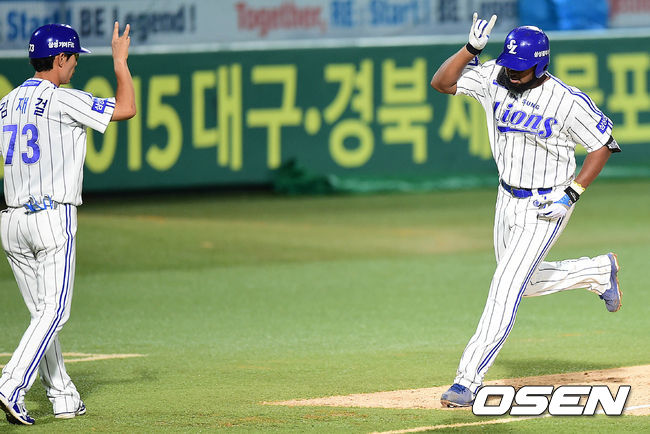 4회말 삼성 공격 1사 2루 상황 나바로가 좌월 투런포를 날리고 그라운드를 돌며 김재걸 코치와 인사를 나누고 있다.