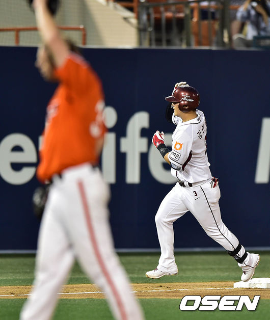 4회말 1사 1루에서 넥센 김민성이 중월 투런 홈런을 치고 있다.