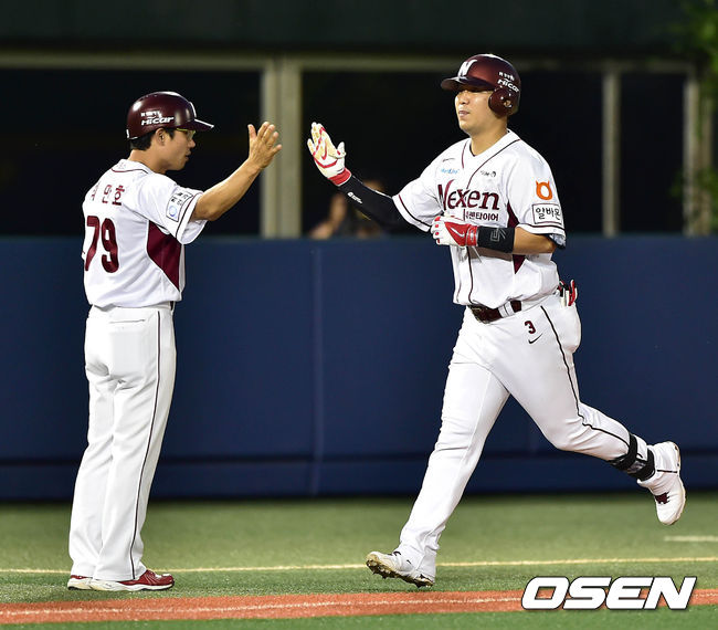 4회말 1사 1루에서 넥센 김민성이 중월 투런 홈런을 치고 최만호 코치와 하이파이브를 하고 있다.
