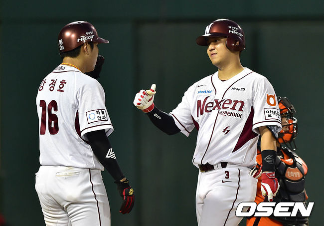 4회말 1사 1루에서 넥센 김민성이 중월 투런 홈런을 치고 홈에서 강정호와 하이파이브를 하고 있다.