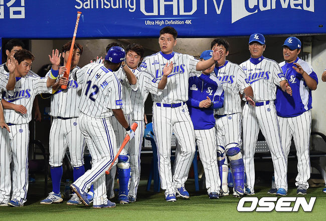 4회말 삼성 공격 1사 2루 상황 나바로가 좌월 투런포를 날리고 홈을 밟은 뒤 더그아웃 동료들과 인사를 나누고 있다.