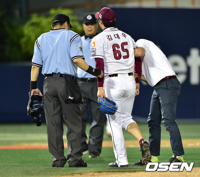 5회초 무사에서 한화 피에의 타구를 맞은 넥센 김대우가 김영민과 교체되고 있다.