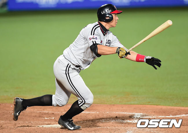 5회초 LG 공격 2사 2루 상황 오지환이 추격의 1타점 우중간 3루타를 날리고 있다.