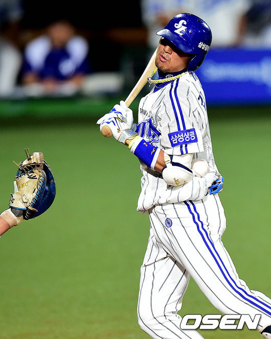 5회말 삼성 공격 2사 1, 2루 상황 김상수가 LG 투수 신승현의 투구에 몸을 맞고 있다.