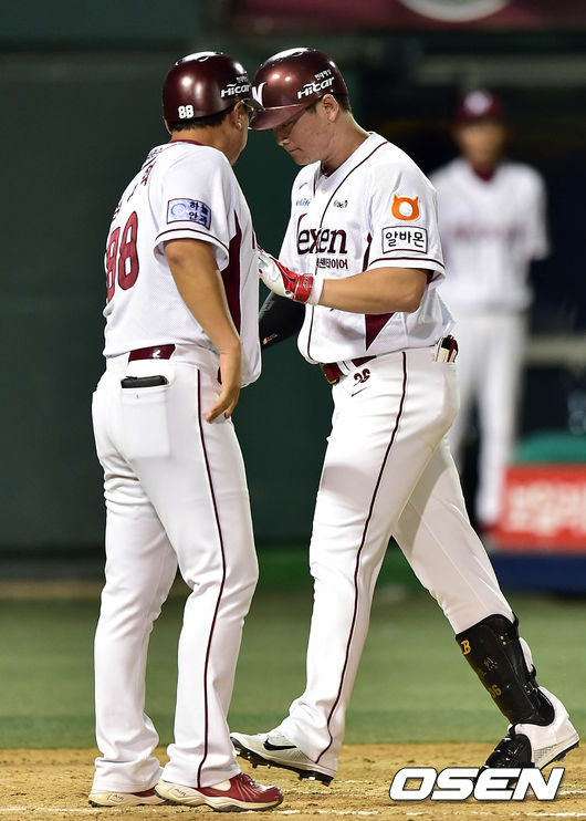 7회말 1사에서 넥센 이성열이 우월 솔로 홈런을 치고 홈에서 심재학 코치와 하이파이브를 하고 있다.