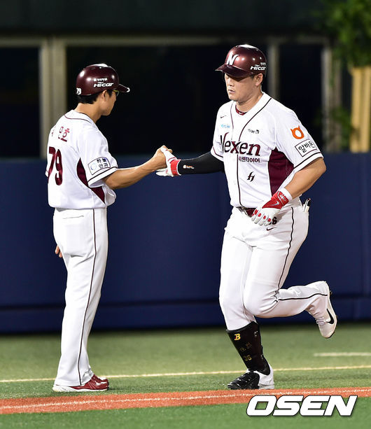 7회말 1사에서 넥센 이성열이 우월 솔로 홈런을 치고 홈에서 최만호 코치와 하이파이브를 하고 있다.
