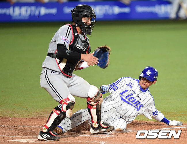 7회말 삼성 공격 무사 2루 상황 박한이의 우전안타 때 주자 강명구가 홈까지 파고들어 세이프되고 있다.