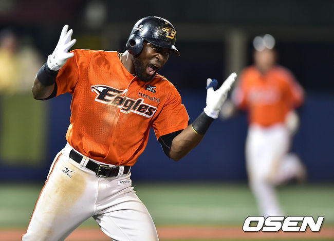 8회초 2사 1,2루에서 한화 피에가 우월 스리런 홈런을 치고 환호하고 있다.