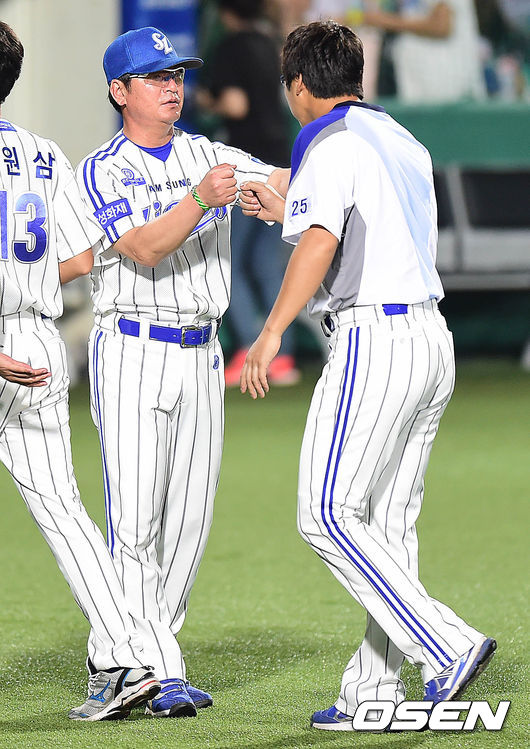 승리투수가 된 삼성 배영수가 류중일 감독과 인사를 나누고 있다./dreamer@osen.co.kr