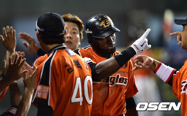 8회초 2사 1,2루에서 한화 피에가 우월 스리런 홈런을 치고 더그아웃에서 동료들과 환호하고 있다.